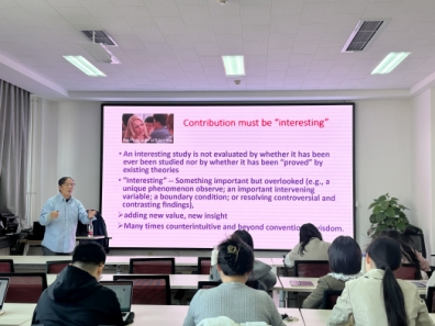 王承璐教授从期刊主编的角度出发,围绕“论文题目、引言、文献综述、研究假设、研究设计与验证、研究结论、理论贡献与实践启示、研究局限与展望”八个部分的写作展开讲座,一一递进,强调以讲故事的方式写好论文,以吸引审稿人和读者的注意力。王承璐教授深入浅出地阐述了论文写作过程中可能出现的主要问题,针对如何避免这些问题为与会师生提出了建议。