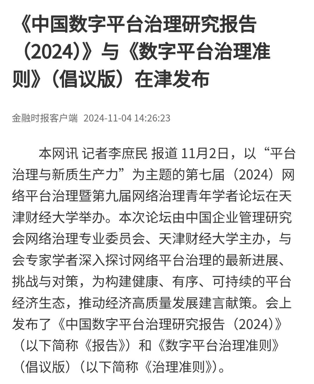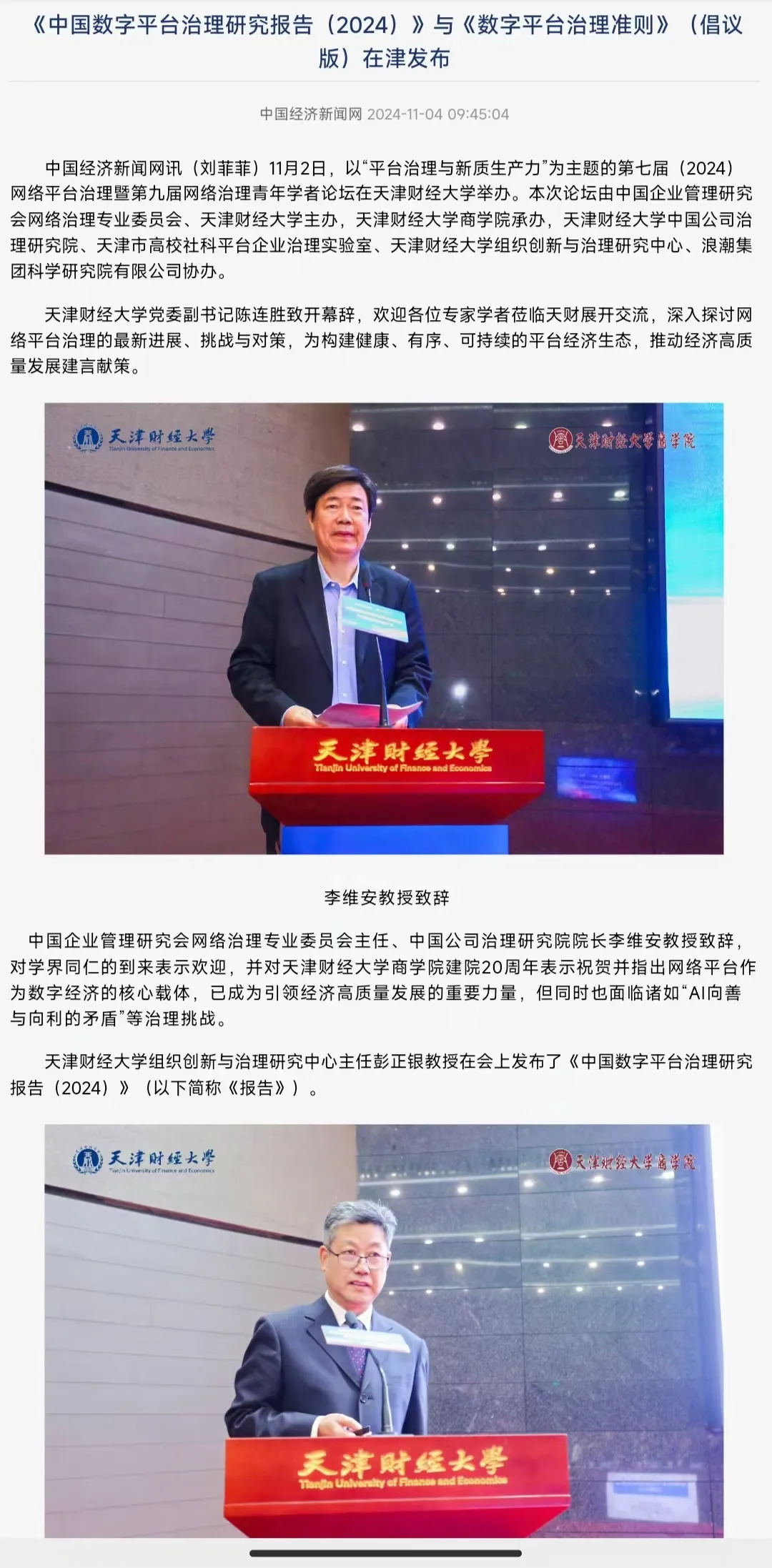 本次论坛深入探讨网络平台治理的最新进展、挑战与对策,为构建健康、有序、可持续的平台经济生态,推动经济高质量发展建言献策。中国经济新闻网、《金融时报》、《中国出版传媒商报》、天津频道、数据视野等多家媒体对此次活动进行报道!