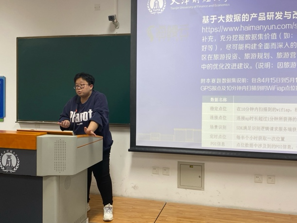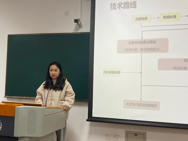 本届“数客杯”海鳗赛题的获奖团队成员针对各自作品《基于天津市游客行为特征分析及应用》与《天津特色旅游线路产品规划与营销策略研究》进行了精彩汇报,展现了他们对旅游行业的深刻洞察。团队借助大数据技术深入剖析游客行为,为产品创新提供了数据支撑,并推出了创新的旅游线路设计与营销策略,体现了团队的专业能力。