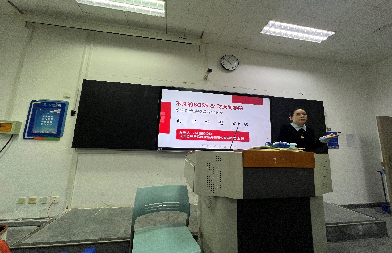 市场营销系《商业伦理道德》的课堂上,天津合纵商业服务有限公司负责人王婧(“不凡的BOSS”企业家)为学生们带来了一场精彩的讲座“企业的社会责任与个人职业的发展规划”。她强调企业不仅追求利润,还承担着对多方利益相关者的社会责任;详细分析了人力资源管理的关键环节,包括企业战略协同、人才选拔培养、招聘流程、绩效评估、培训与目标管理,以及合同续签与解除;同时,她还阐述了物业服务中客服、环境、安防和工程等条线的重要性。最后,王总提供了关于提升职场竞争力、获取就业机会和创业挑战的个人职业发展指导,帮助学生理解如何在职场中有效规划自己的职业生涯。