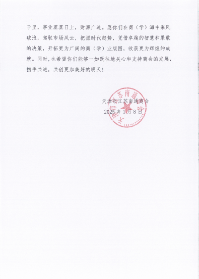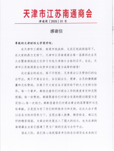 天津市江苏南通商会就“首届校友企业家工作坊”的成功举办向英超直播 发来感谢信