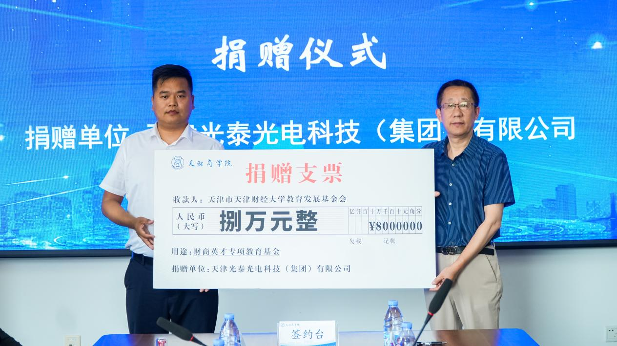 天津财经大学教育发展基金会理事长、财务处处长王健与天津光泰光电科技(集团)有限公司董事长饶古清签订《天津财经大学财商英才专项教育基金捐赠协议书》