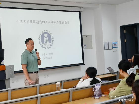 人力资源管理系举办了“十五五发展周期内的企业领导力建构思考”专题讲座。此次讲座特邀南开大学博士、天津才智企业管理咨询有限责任公司总经理、天津市国资委研究院特聘顾问时博老师担任主讲,时老师以“重新审视领导力的内涵”为切入点,通过经典案例分析指出领导力并非与生俱来,而是在实践中不断学习与完善的成果。他引用领导力11条原则和执行力22条规范,阐述了专业精湛、责任担当、决策能力、团队合作等要素在领导力构建中的重要性。