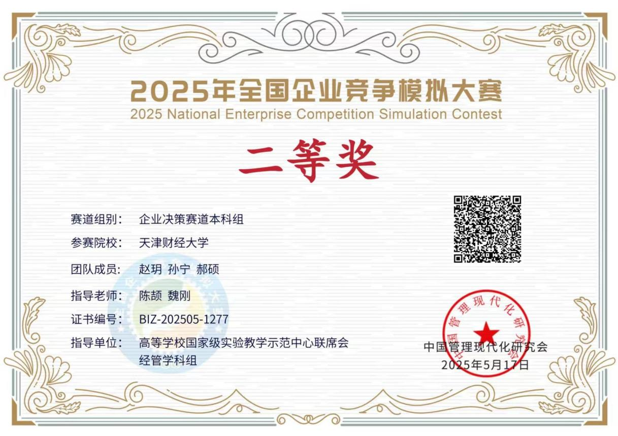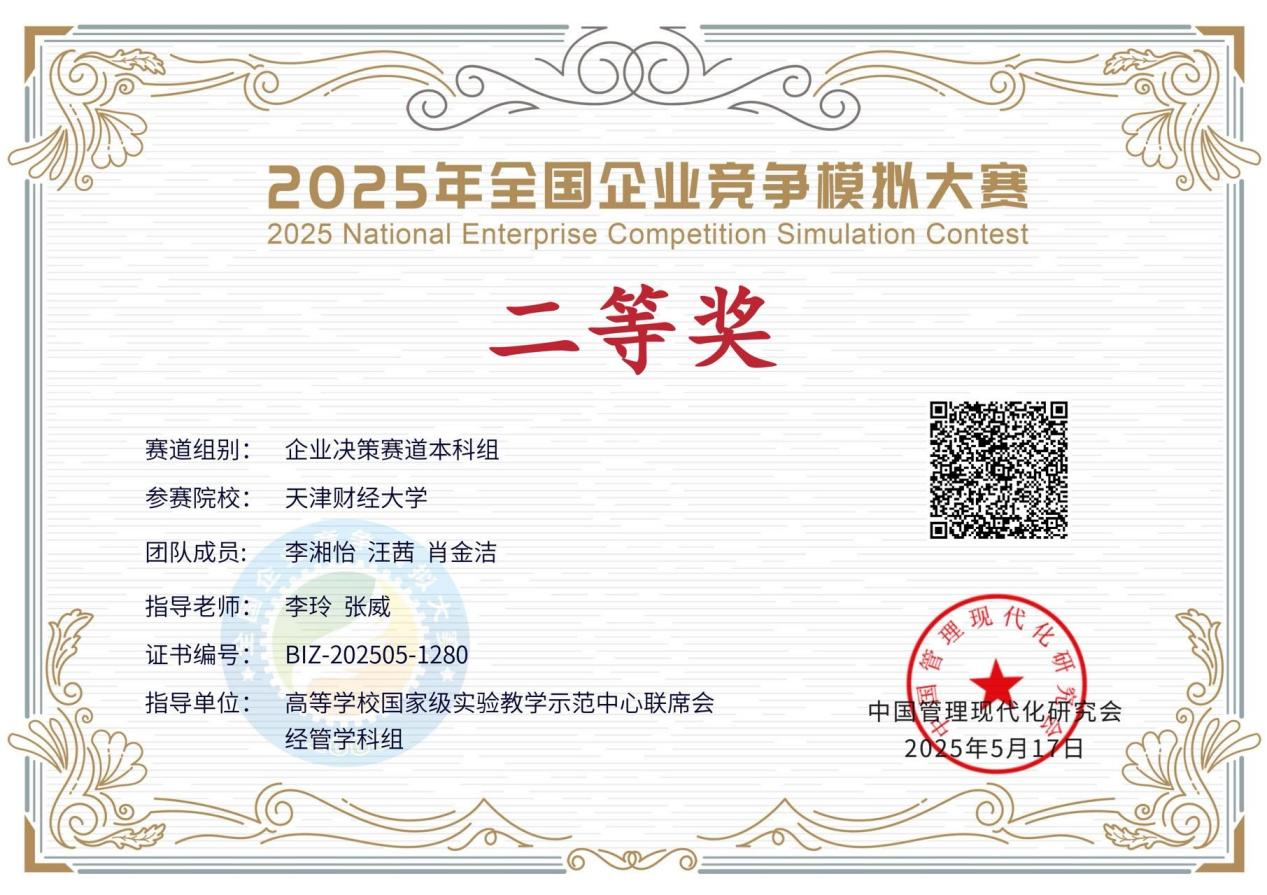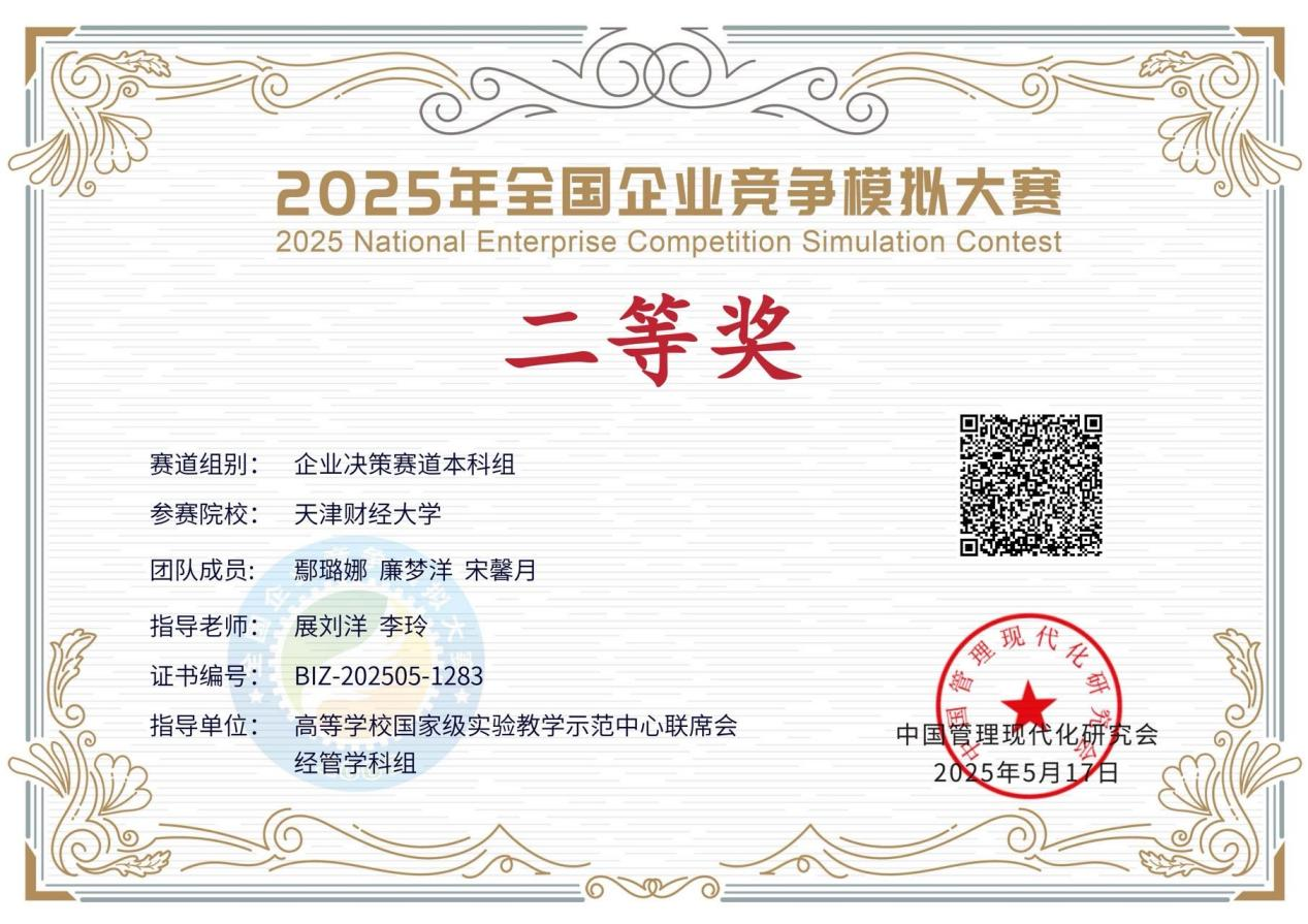 图2 天津财经大学2025年企业竞争模拟大赛获奖证书
