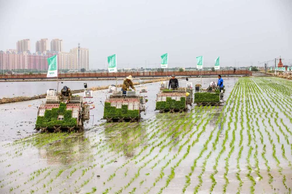 在西青区王稳庄镇的中化现代农业天津示范农场,数台插秧机将嫩绿的秧苗整齐插入水田。这里水稻的耕、种、管、收等环节都与物联网、无人机、卫星遥感等科技结合,实现遥感巡田、精准气象、精准植保等机械化、智能化管理。
