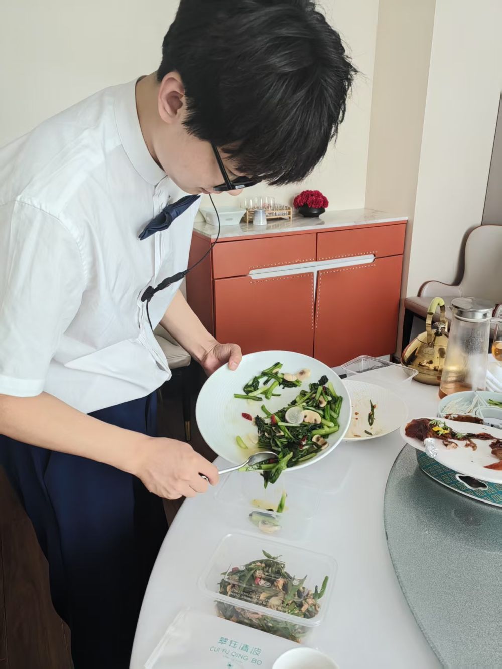 6月8日,天津市西青区翠钰清波餐厅店员帮助顾客打包剩余饭菜