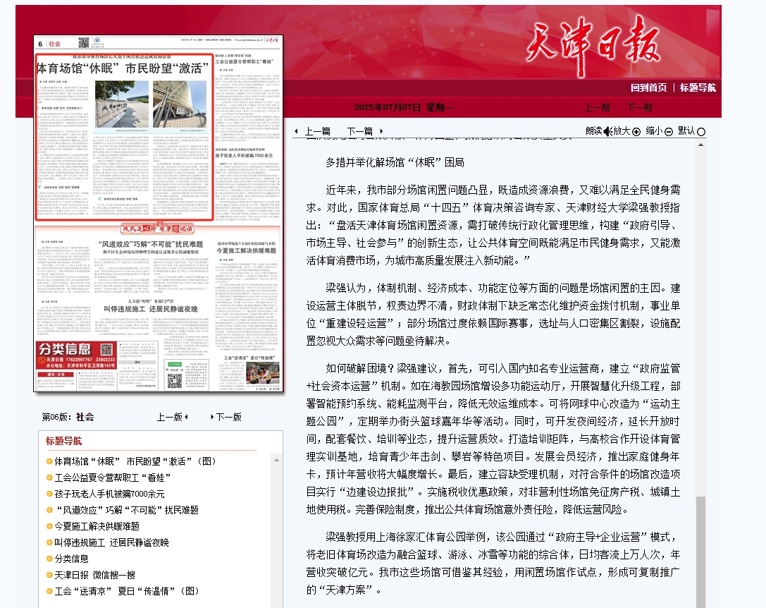 《天津日报》记者采访英超直播 教授梁强:体育场馆“休眠” 市民盼望“激活”