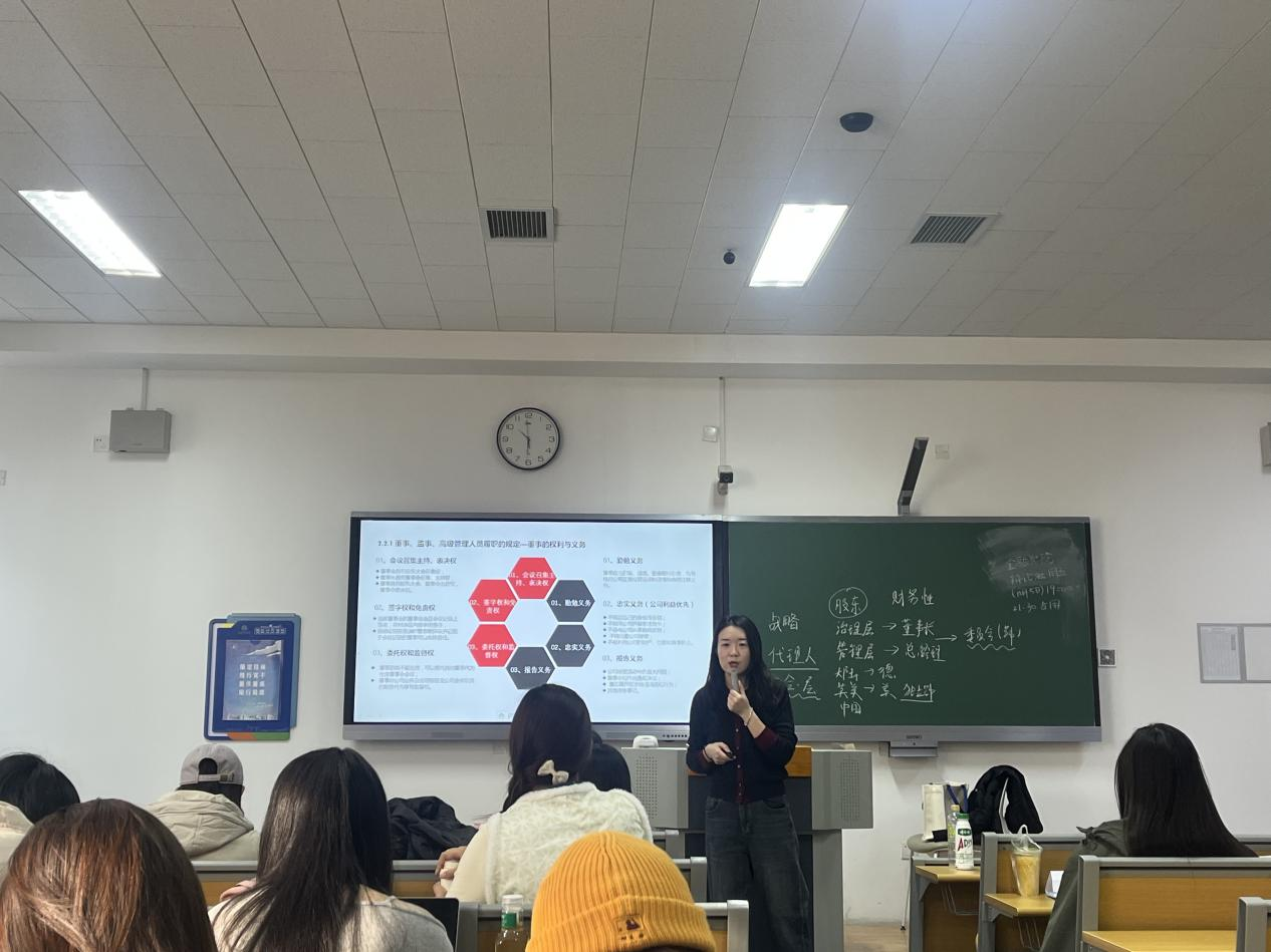 分享过程中,杨菲校友还结合自身成长经历,与同学们交流了职业发展心得,详细解答了大家在专业学习、实习就业等方面的疑问,为同学们提供了极具针对性的指导。此次课堂分享不仅让同学们跳出课本,对公司治理实务有了更为感性、立体的认知,更是让大家接触到“证券事务代表”这一职业方向,了解了该职业所需的专业素养、综合能力与发展路径,为未来职业规划提供了新的思路。