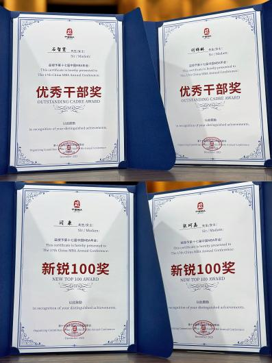 MBA中心荣获“2025中国MBA卓越校友会”“2025中国MBA卓越品牌活动”“2025中国MBA优秀联合会”三项荣誉;院长张建宇荣获“2025中国MBA教育贡献奖”,王谦老师获评“2025中国MBA优秀指导老师奖”;校友王锡泉斩获“2025中国MBA优秀创业成就奖”,校友宋海兰、韩学峰荣获“2025中国MBA优秀校友奖”;学生石智贤、何锦琳获评“2025中国MBA优秀干部奖”,学生张珂嘉、闫康入选“2025中国MBA新锐100奖”。