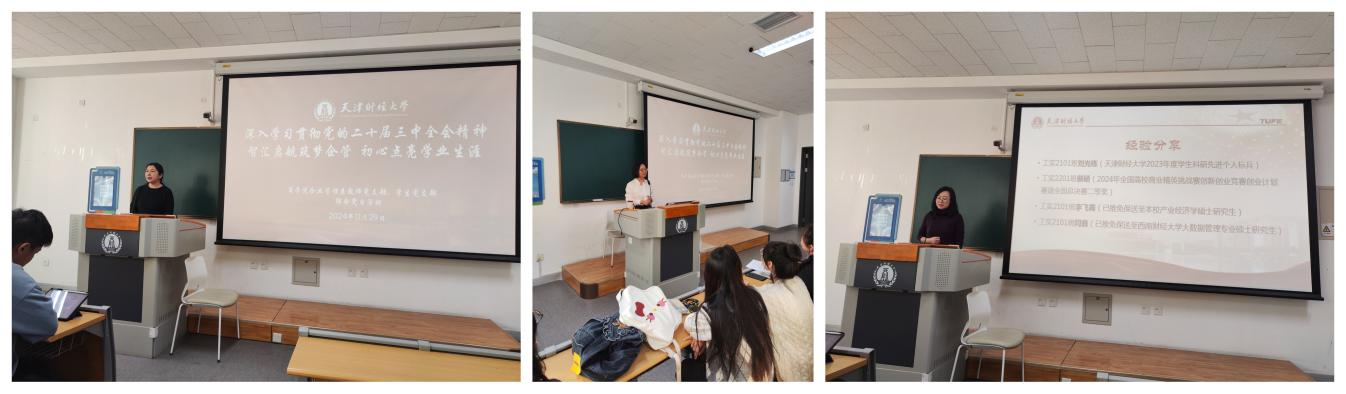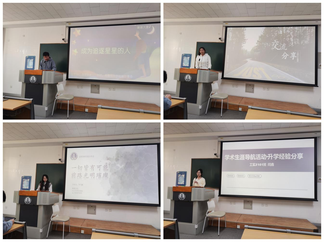 在经验分享环节,天津财经大学2023年度学生科研先进个人标兵、工实2101班的刘光栋同学基于自身的科研实践,细致入微地分享了科研和竞赛选题的独特视角、高效工具以及实用技巧,为同学们的科研和竞赛活动提供了极具价值的参考;工实2201班的郝硕同学以其参与的2024年全国高校商业精英挑战赛创新创业竞赛创业计划赛道全国总决赛二等奖的作品为切入点,详细阐述了项目申报初期挖掘潜在价值点、组建合适团队的方法等,为同学们的竞赛之路提供了宝贵的参考经验;工实2101班的李飞霞同学从“保研边缘人”的视角,细致分享了备战保研过程中的实用策略,同时传递出一种积极向上、永不言败的精神风貌,激励同学们面对困难时要保持坚韧不拔、自信乐观的风姿风貌;工实2101班的闫鑫同学则从推免保研的全过程入手,为同学们分享了各阶段的重点任务与应对策略,以及课外自主学习、高效获取信息的工具与技巧,为同学们在追求学术卓越与个人发展的道路上提供了有益的启示。