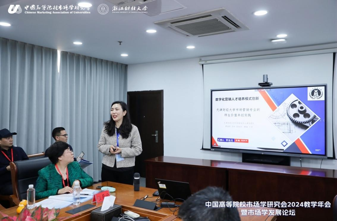 曹海英老师在分论坛三“教学成果/教学论文展示专场”的教学成果展示阶段,分享了《数字化营销人才培养模式创新—天津财经大学市场营销专业的师生价值共创实践》,并获评年会优秀教学创新成果。该成果通过从专业建设层面剖析,明确“数字化营销”的专业培养定位,重构课程体系并引入新的教学理念,即师生价值共创理念,搭建“1+3+X”金字塔制度体系,以培养学生研究能力为核心目标,分别从理论问题探索、现实问题探索两个路径,多举措促进师生共创、价值共享、共建国家一流本科专业。