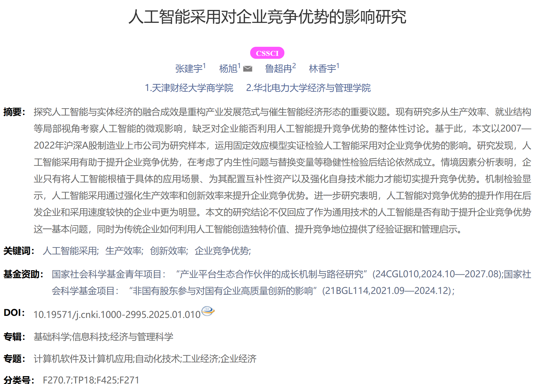 企业管理系张建宇教授及其博士生杨旭、林香宇在国内高水平期刊《科研管理》合作发表题为“人工智能采用对企业竞争优势的影响研究”的论文,华北电力大学经济与管理英超直播