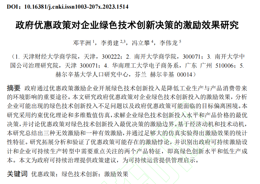 物流与供应链管理系邓芊洲老师的论文“政府优惠政策对企业绿色技术创新决策的激励效果研究”在中文高水平期刊《中国管理科学》网络首发。