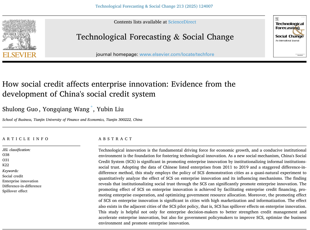 物流与供应链管理系郭树龙副教授与刘玉斌教授合作在英文高质量期刊Technological Forecasting and Social Change于2025年2月在线发表题为“How social credit affects enterprise innovation:Evidence from the development of China's social credit system”的学术论文。