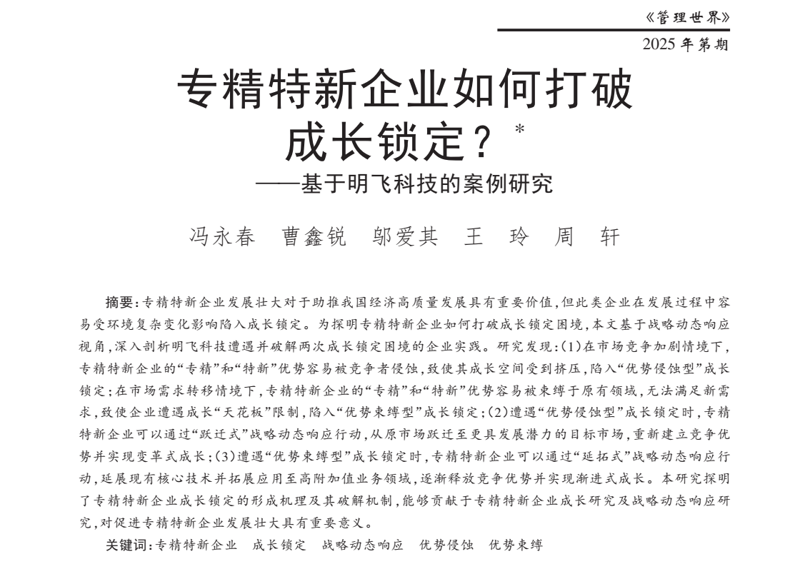 企业管理系冯永春副教授团队在国内管理学顶级期刊《管理世界》发表学术论文“专精特新企业如何打破成长锁定?——基于明飞科技的案例研究”。